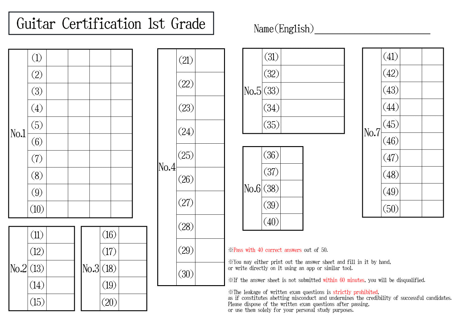 【Answer Sheet】Guitar Certification 1st Grade(Expert)