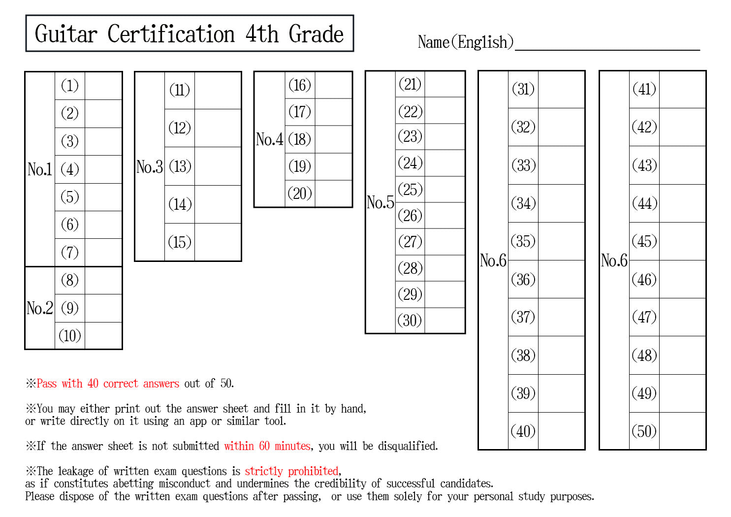 【Answer Sheet】Guitar Certification 4th Grade(Intermediate)
