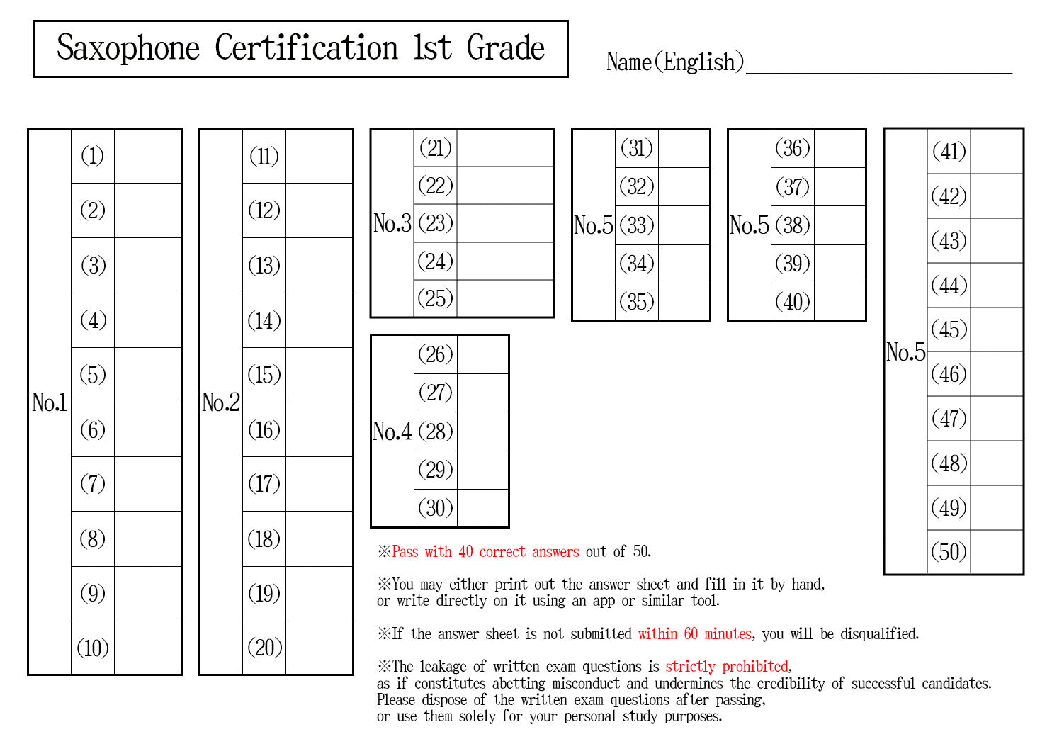 【Answer Sheet】Saxophone Certification 1st Grade(Expert)