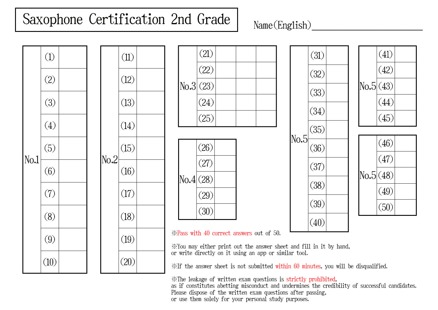 Written Exam of Saxophone Certification 2nd Grade(Professional).
